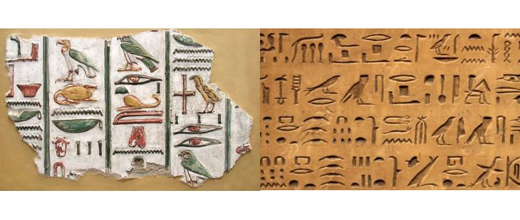 Consistem em uma combinação de símbolos que representam palavras ou sons específicos. Eram inscritos em paredes de templos, túmulos , monumentos, bem como em papiros e outros materiais escritos.