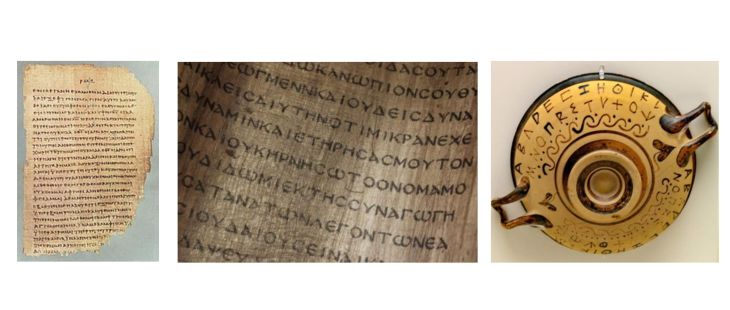 Entre os séculos séculos XVI a.C. e XII a.C., em Creta e nas zonas da Grécia Continental, era utilizado este alfabeto (conhecido pelos técnicos como linear B). Esse alfabeto se parece como uma versão primitiva dos dialetos arcado-cipriota e jónico-ático, dos quais provavelmente é antepassado, e é conhecido habitualmente como grego micênico. Posteriormente, mercadores fenícios introduziram o uso, na Grécia, do denominado alfabeto fenício que não necessita de notar as vogais, ao contrário da língua grega e outras da família indo-europeia, como o latim e em consequência o português. Os gregos adaptaram alguns caracteres do alfabeto fenício sem valor fonético, em grego, para representar as vogais, fato fundamental que tornou possível a transcrição fonética satisfatória das línguas europeias.